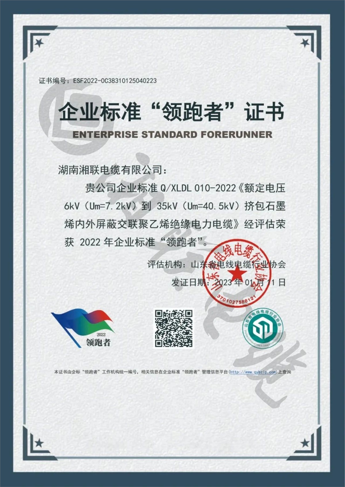 1月,湖南湘聯(lián)電纜有限公司三項(xiàng)企業(yè)標(biāo)準(zhǔn)經(jīng)評定,榮獲2022年全國企業(yè)標(biāo)準(zhǔn)“領(lǐng)跑者”。
